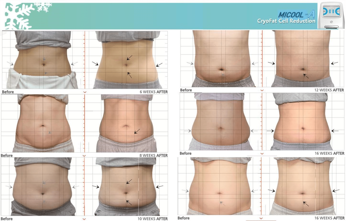 מה התוצאות?  השיטה החדשה  מאפשרת המסת מצבורי שומן והצרת היקפים בבטן, במותניים, בירכיים, בגב העליון ובזרועות, וכך תאי השומן שקוררו והורחקו מהגוף אינם נוצרים מחדש. לאחר 90 יום ניתן לצפות להפחתה של עד 4.5 ס"מ בהיקף האזור המטופל, ללא ניתוח, ללא כאבים וללא תופעות לוואי.